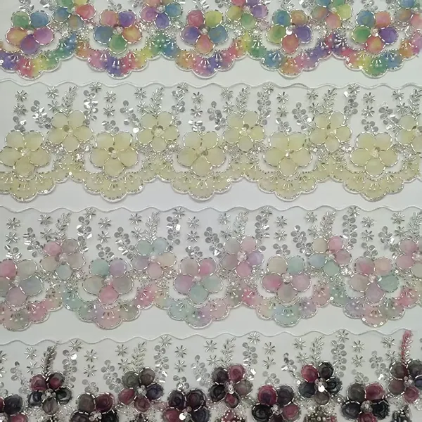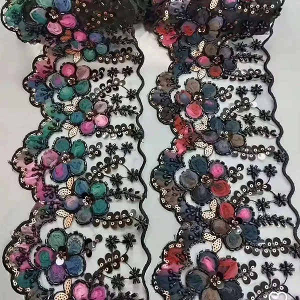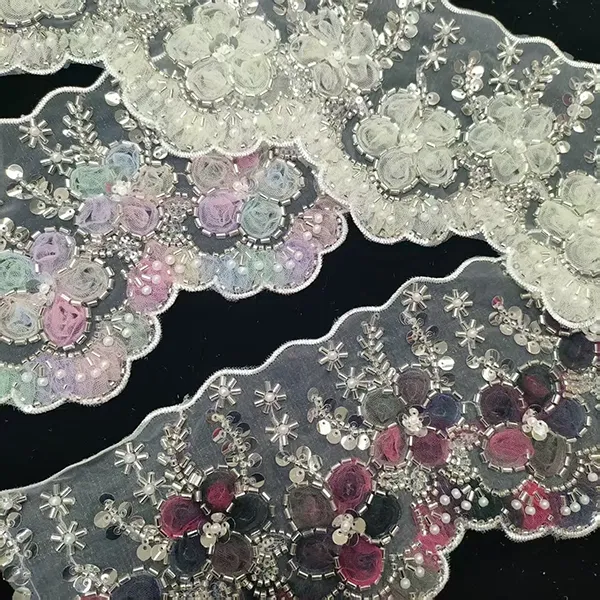 | hàng hóa | Ren thêu nhiều màu với lưới 3D hoa ruy băng ống đính cườm ren thêu mã vạch | ||