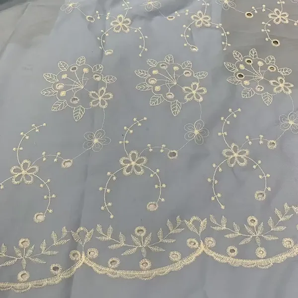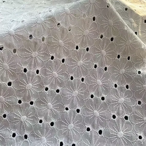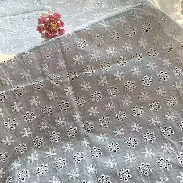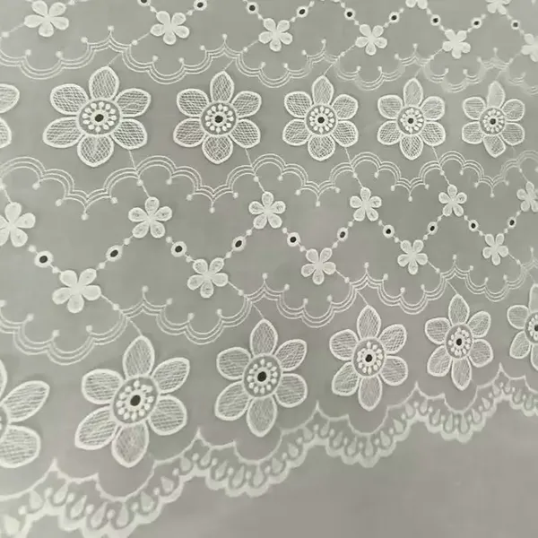 Vải mắt thêu bằng vải bằng bông trắng cho trang phục vải ren thanh lịch này có tính năng thêu tinh tế và cắt nhỏ mắt, tạo ra một chất liệu thoáng khí, nhẹ hoàn hảo cho váy, áo cánh và trang phục cô dâu. Các mẫu hoa phức tạp và các cạnh sò có thêm một nét quyến rũ lãng mạn, cổ điển, trong khi bông tự nhiên đảm bảo sự mềm mại và thoải mái.